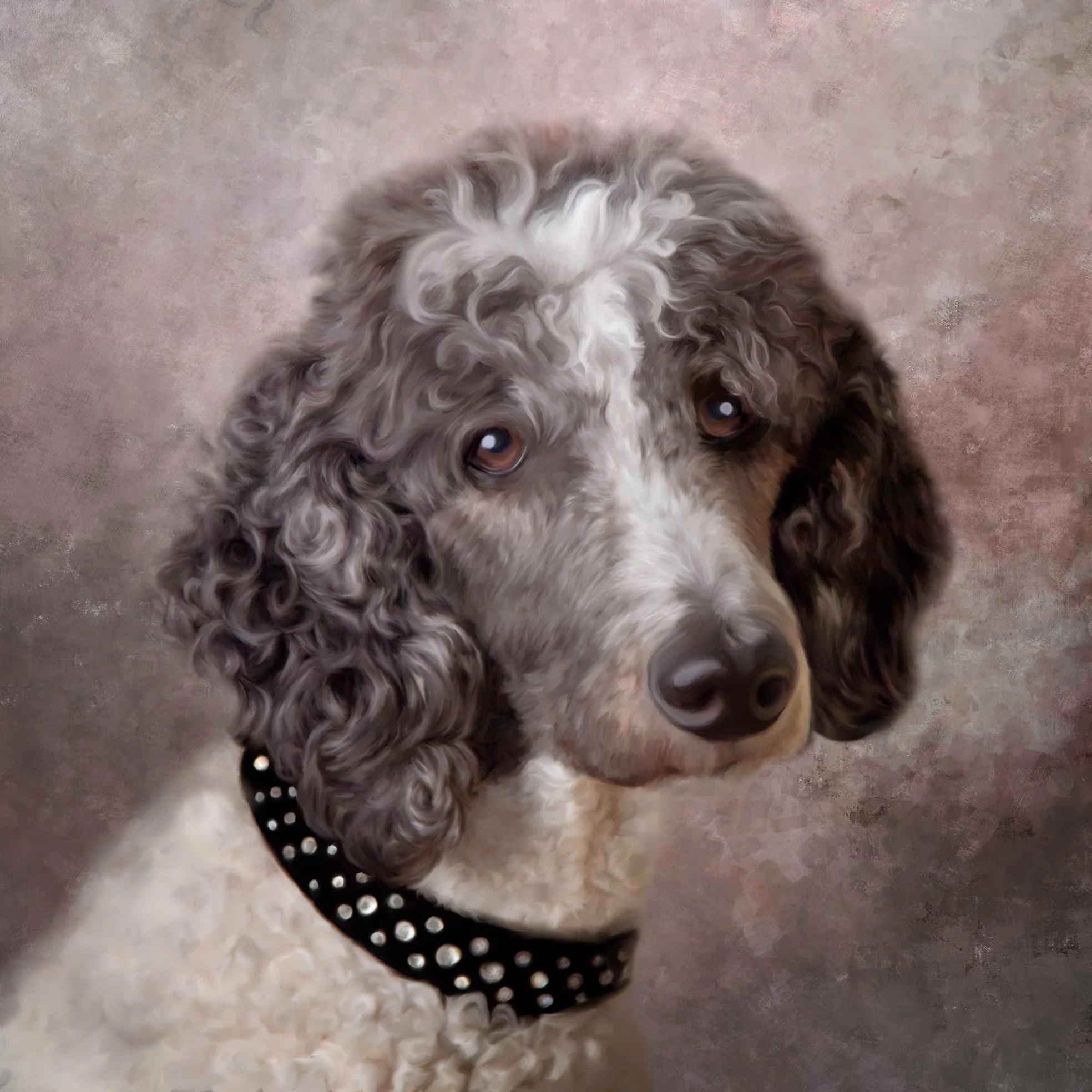 This is a painting I did of my poodle Maggie. It hangs in my studio, printed on canvas and then finished with hand applied paint and varnish.